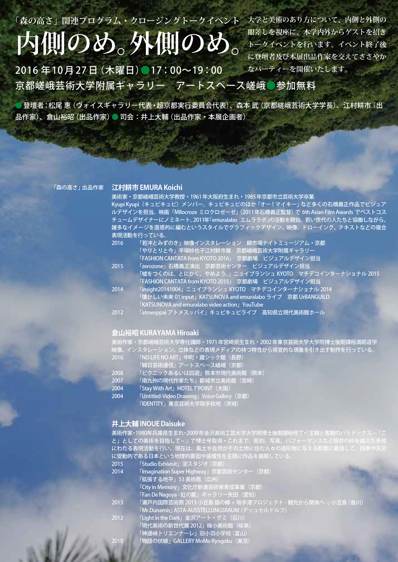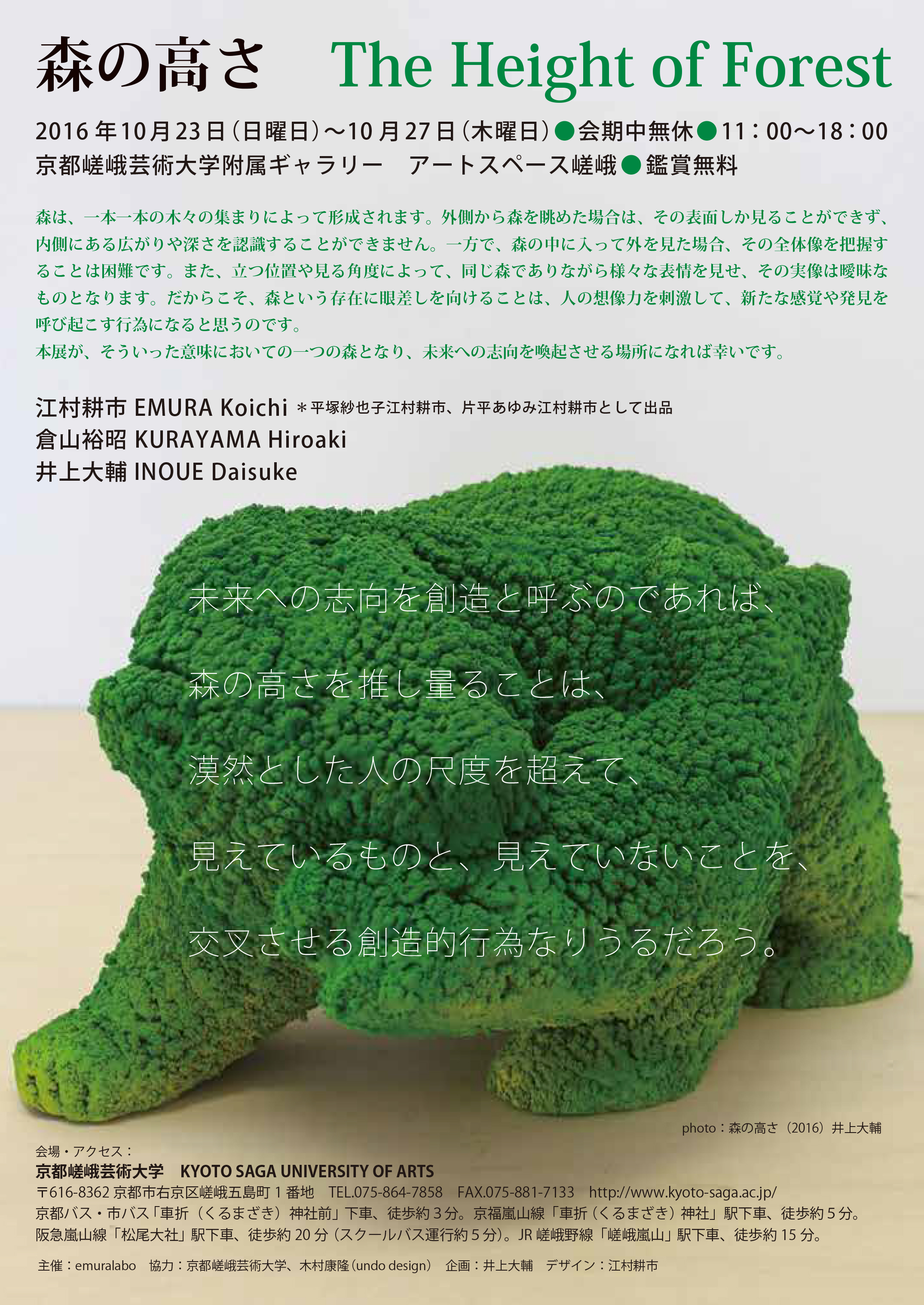 井上大輔、江村耕市、倉山裕昭の三人展。江村は平塚紗也子江村耕市と片平あゆみ江村耕市の「やりとり」で参加。主催:嵯峨美術大学江村研究室+emuralabo