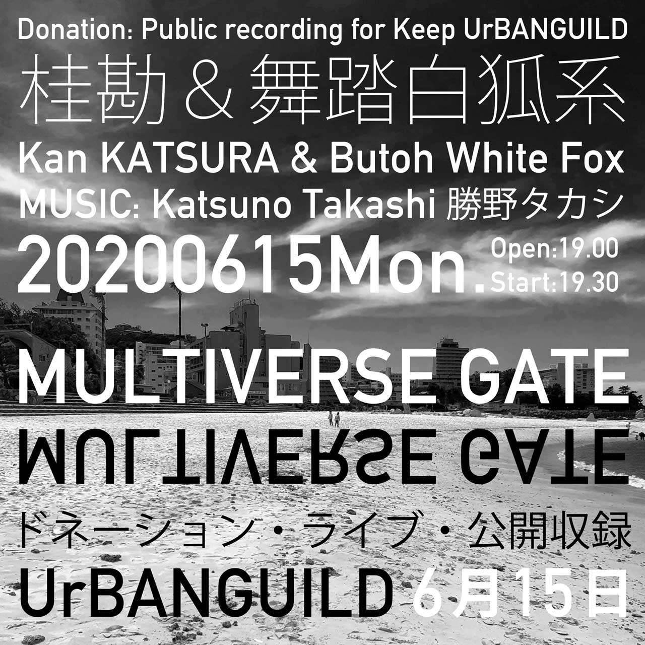 勝野タカシとemuralaboの共同企画の第1回目。桂勘&舞踏白狐系を迎えて、量子宇宙論的MULTIVERSEの門の前に生きる、年老いた白鳥、蛙男、風に聞く女、思索する男の4パートで構成された作品。即興音楽と舞踏の対峙にカメラが反応して収めた映像を編集して一つのかたまりとして提示するということ。2020年6月15日UrBANGUILDにて公開収録。